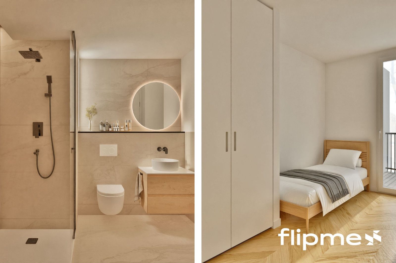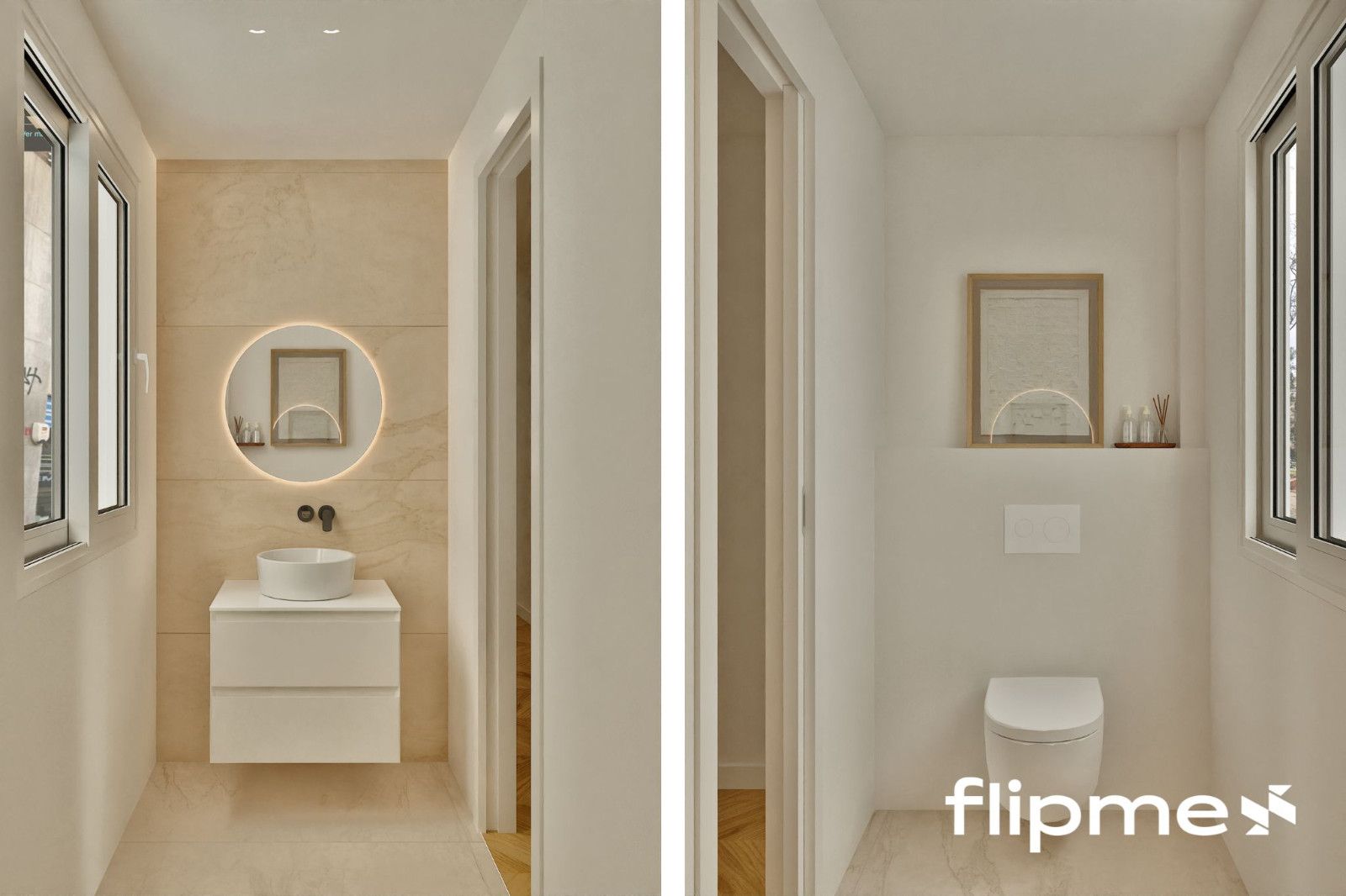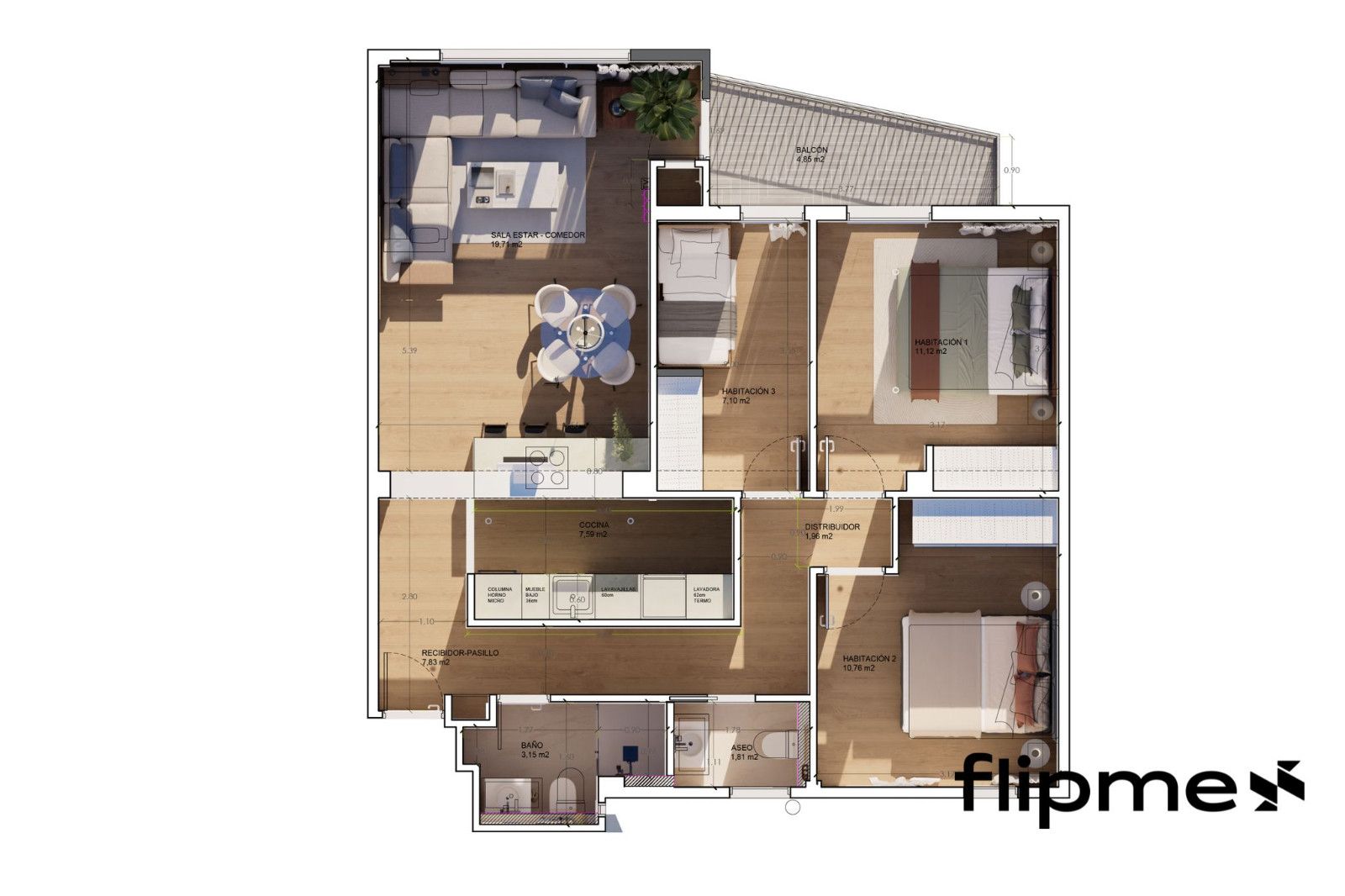 La zona de noche dispone de tres habitaciones bien proporcionadas y dos baños (uno completo y un aseo), ofreciendo una distribución equilibrada, perfecta para una pareja joven que busca un hogar cómodo y funcional.
